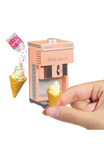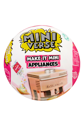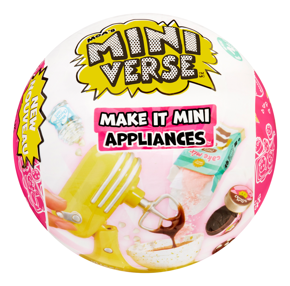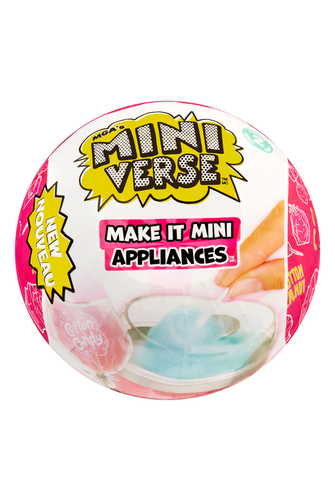 All new mini appliances that actually work! Use these appliances to help you MAKE, SET, and DISPLAY fun treats from the Make It Mini Foods line! Each ball comes with one real working mini appliance, plus all the accessories and ingredients to make your mini replica food treat. Appliances include: Cotton Candy Machine, Snow Cone Machine, Stand Mixer, and a Soft Serve Machine, each in 2 different colours, for a total of 8 machines to collect.