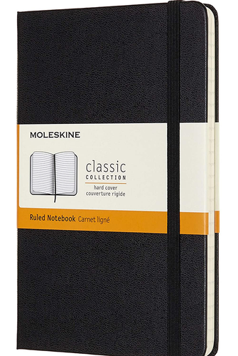 This discreet black medium Moleskine Classic Notebook invites you to tell your own story on its pages through the words, ideas, plans and lists that fill your mind and shape your day. Like all Moleskine Classic Notebooks, it has a matching bookmark ribbon to help you stay organised and efficient, as well as a colour-coordinated elastic closure and rounded corners to ensure your notes are protected and secure both in your bag and on the move. The front flyleaf features the distinctive 'In case of loss' notice to record your name and a prize of your choice for anyone who returns your notebook if lost. Finally, the expandable back pocket is designed to hold the loose notes, tickets, flyers and mementos that complete your story.