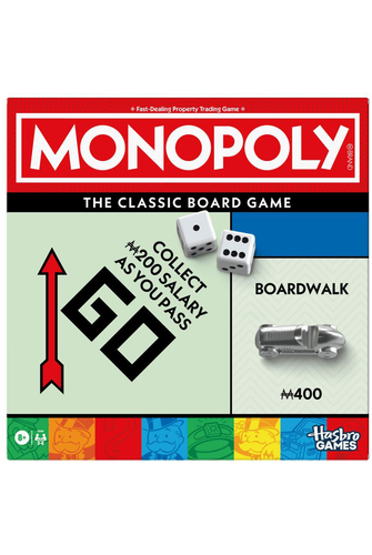 Go big or go broke in the Monopoly board game! In this edition of the fun family game, experience the classic gameplay fans know and love, plus improved features. We've included a sleek storage tray to keep cash, cards, and components organized. We've also increased the size of the tokens, houses, and hotels from those in previous editions for easier handling. Players move around the board buying as many properties as they can. The more they own, the more rent they'll be able to collect from others. The last one with money, when all other players have gone bankrupt, wins! Looking for fun games for game night? This family board game for kids and adults is an exciting choice. Monopoly games and family games for kids and adults are great kids gifts, too. Includes Gameboard, 8 Tokens, 28 Title Deed Cards, 16 Chance Cards, 16 Community Chest Cards, 32 Houses, 12 Hotels, 2 Dice, Storage Tray, Money Pack, and Game Guide.