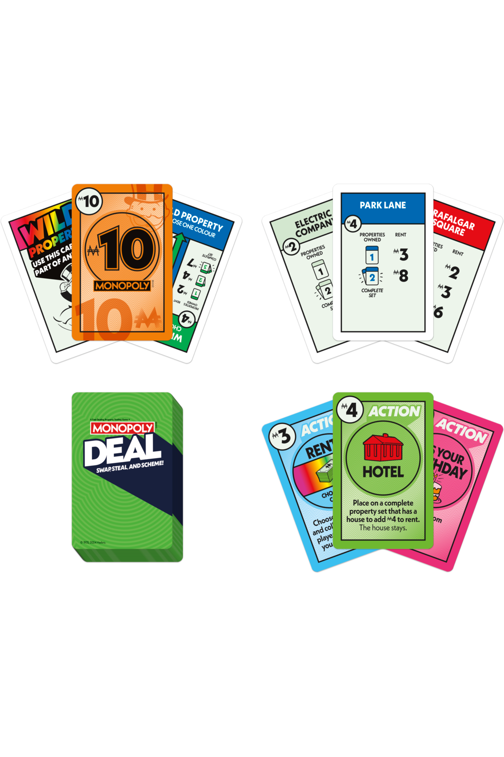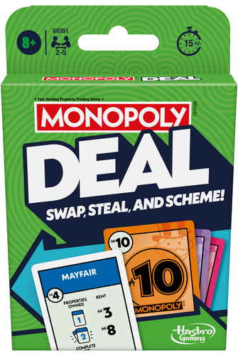 Swap, steal, and scheme with the Monopoly Deal card game! Be the first player to collect 3 complete Property card sets, each in a different colour, to win. This deck includes 110 cards: Property cards, Wild Property cards, Action cards, and Money cards. Wild Property cards help players build Property sets. Action cards mix up the game by letting players collect rent, steal and swap properties, and more. And players pay their debts with Money cards. Easy to play and set up, this card game for ages 8 and up can be played in as little as 15 minutes! Whether you're searching for fun games for kids and adults, family games, or kids travel games, it's a great pick for anytime play.