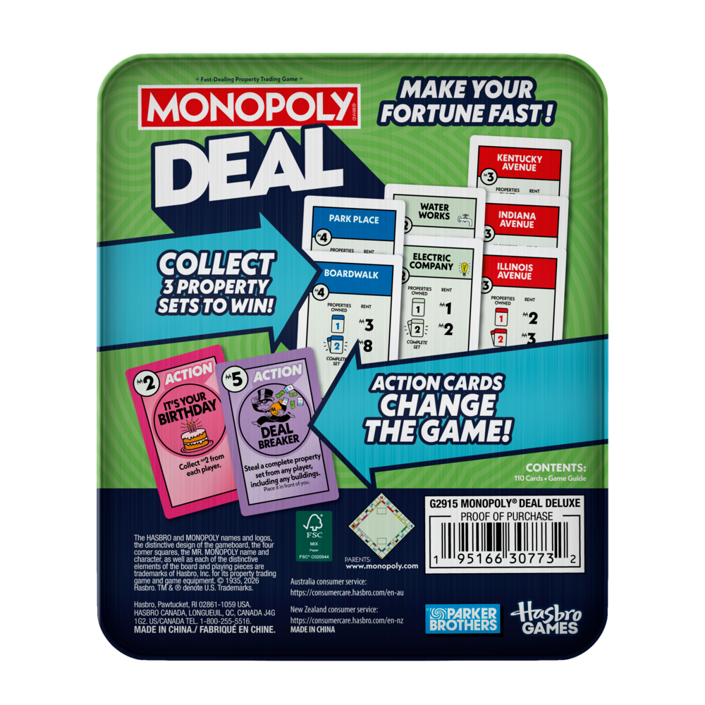 This deluxe edition of the Monopoly Deal game is packaged in a decorative tin case, great for storage, travel, and gifting. The first to collect 3 different property sets-each a different colour-wins. Swap, steal, and scheme to make a fortune fast! Action cards mix up the game by letting players collect rent, take or trade properties, and more. Easy to learn, this family game for kids ages 8+ and adults can be played in as little as 15 minutes. It's a fun kids card game for game nights with family and friends. Monopoly card games and family games are also great kids gifts for birthdays and holidays.