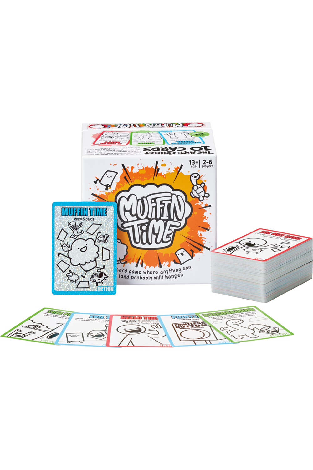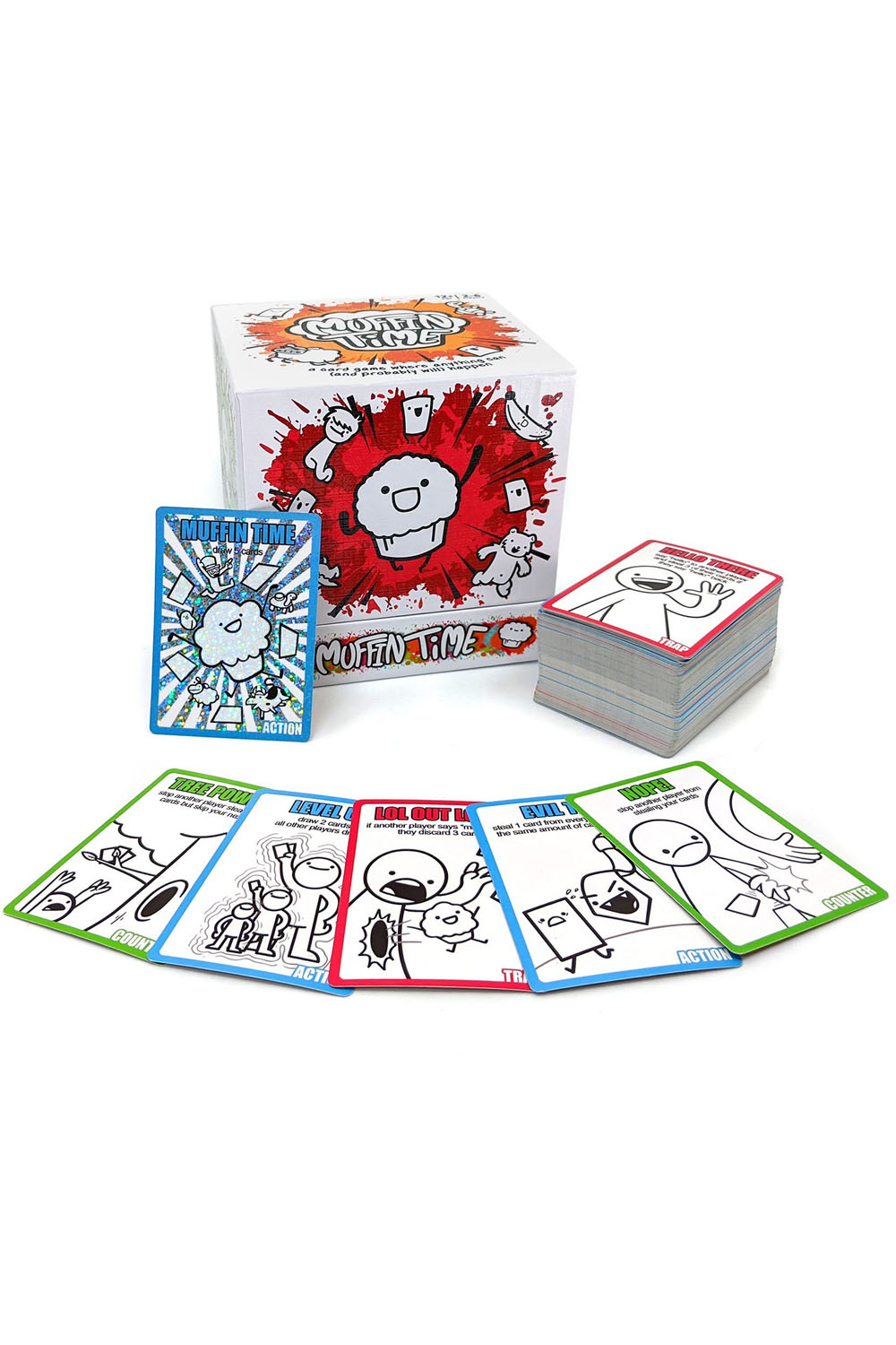 Muffin Time is a chaotic card game with more twists and turns than you can shake a spork at! Battle your friends, family, and hyper-intelligent pets by drawing and playing from a deck of unique cards that'll either help you, thwart others, or mix things up for the sheer hell of it! To win the game, you just need to start your turn with exactly 10 cards in your hand but if you think that'll be easy, you're wrong (wronger than a duck wearing shoes - and that's pretty wrong).