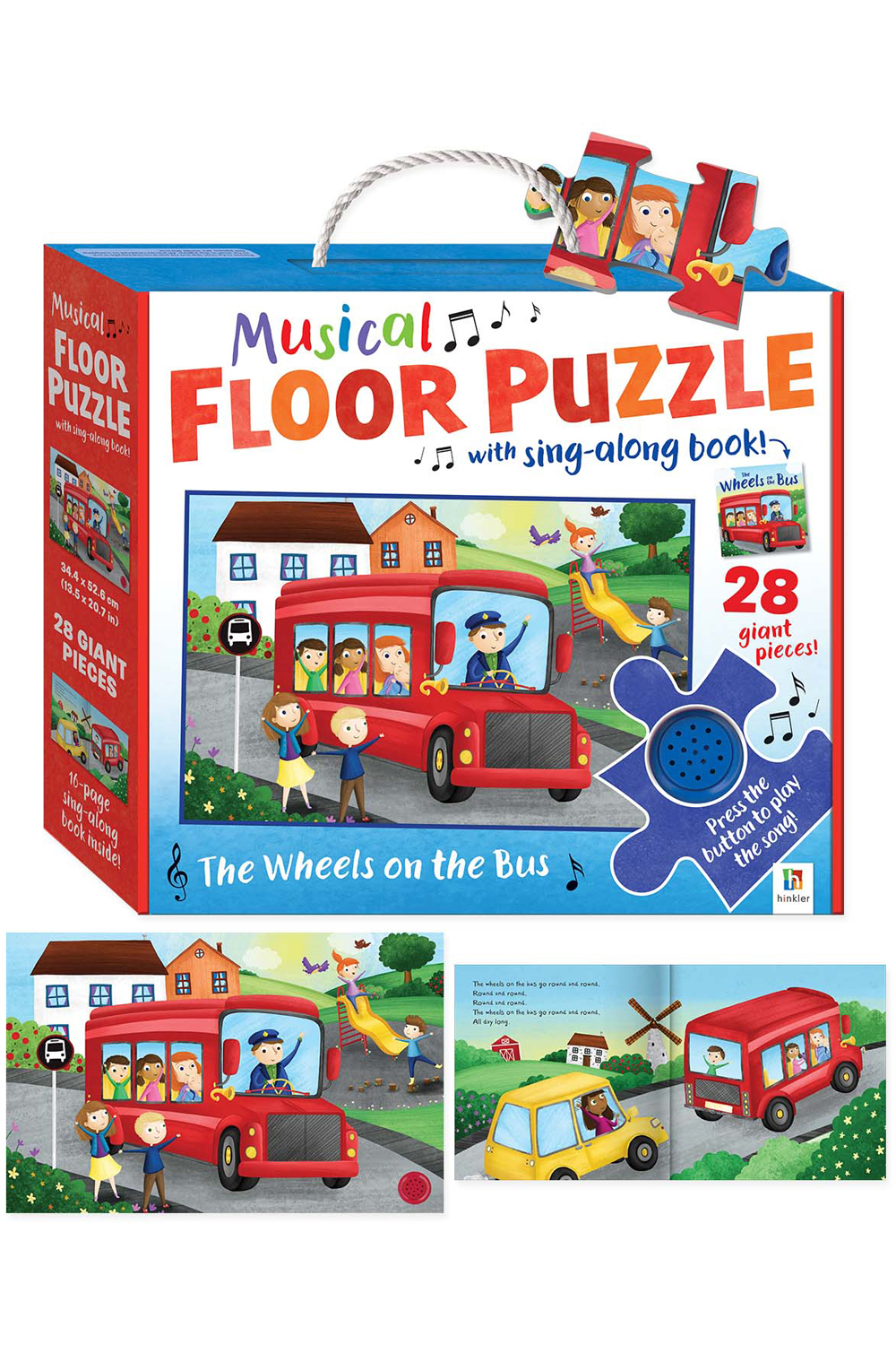 Learning is fun with a Musical Floor puzzle! This 28-piece jigsaw makes a large puzzle featuring a bright, engaging scene of The Wheels on the Bus. Once the puzzle has been put together, press the sound button on the bottom right-hand corner jigsaw piece to hear the familiar song. Enjoy even more learning fun with the 16-page sing-along book including bonus activities!