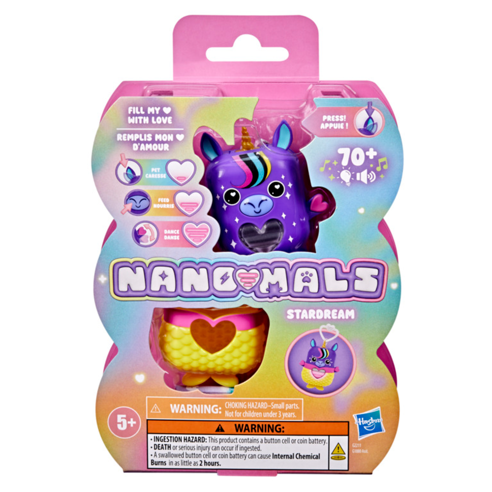 Unlock a world of fidgety, fashionable pocket-sized pets with Nano-mals! Nano-mals are electronic fidget toys and adorable mini companions that need your love! Each Nano-mals character has a colour-changing heart meter that kids can fill in so many fun and satisfying ways. When their heart meter drops, they'll make sounds to let you know they need care. If their heart meter is blue, they needs pets, so press their ears. If their heart is orange, they're hungry - press their mouth to pretend feed them. Is their heart pink? Click their arms up and down to make them dance. What about purple? They want to move! Flip, catch, or shake to fill their heart. Your Nano-mal will celebrate their full heart with a song and colourful lights show. Give them some extra flair with a textured snap-on outfit. Plus, they come with an attached clip, so they make a great kids keychain. Nano-mals are the perfect gift for kids who love animal toys, digital pets, and fidget toys.