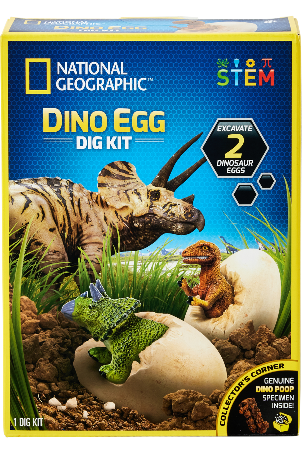 Experience the thrill of discovery with the National Geographic Dino Egg Dig Kit! You'll excavate a fun dinosaur action figure from each of the two egg-shaped dig bricks with the included dig tools. A full-colour learning guide provides fascinating insight into your new dino toys, and a magnifying glass allows you to get a closer look at each one. Plus, you'll also receive a real dino poop (coprolite) fossil! his hands-on science kit is an exciting way to explore the awesome world of palaeontology right at home!