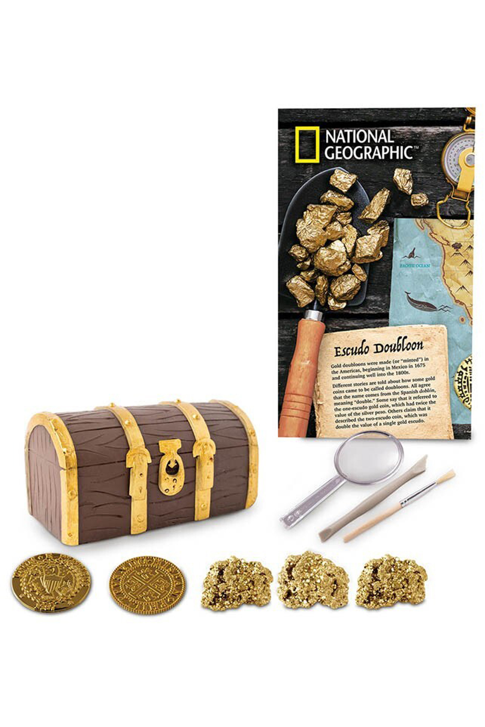 Give your kids the chance to discover exciting artefacts with the National Geographic Gold Doubloon Dig Kit! The treasure chest-shaped dig brick in this kit contains two replica gold doubloons and three real pyrite specimens! Your kids will get all the dig tools they need to excavate their new treasures too! One doubloon is an Escudo replica, a widely used form of currency in many parts of the world in the 18th and 19th centuries. The other doubloon is a Brasher replica, modeled after the rare gold coins minted in the United States in 1787. This exciting, hands-on dig kit will keep your kids entertained for hours, and they'll get to learn more about each piece they uncover with the included treasure guide poster inside!