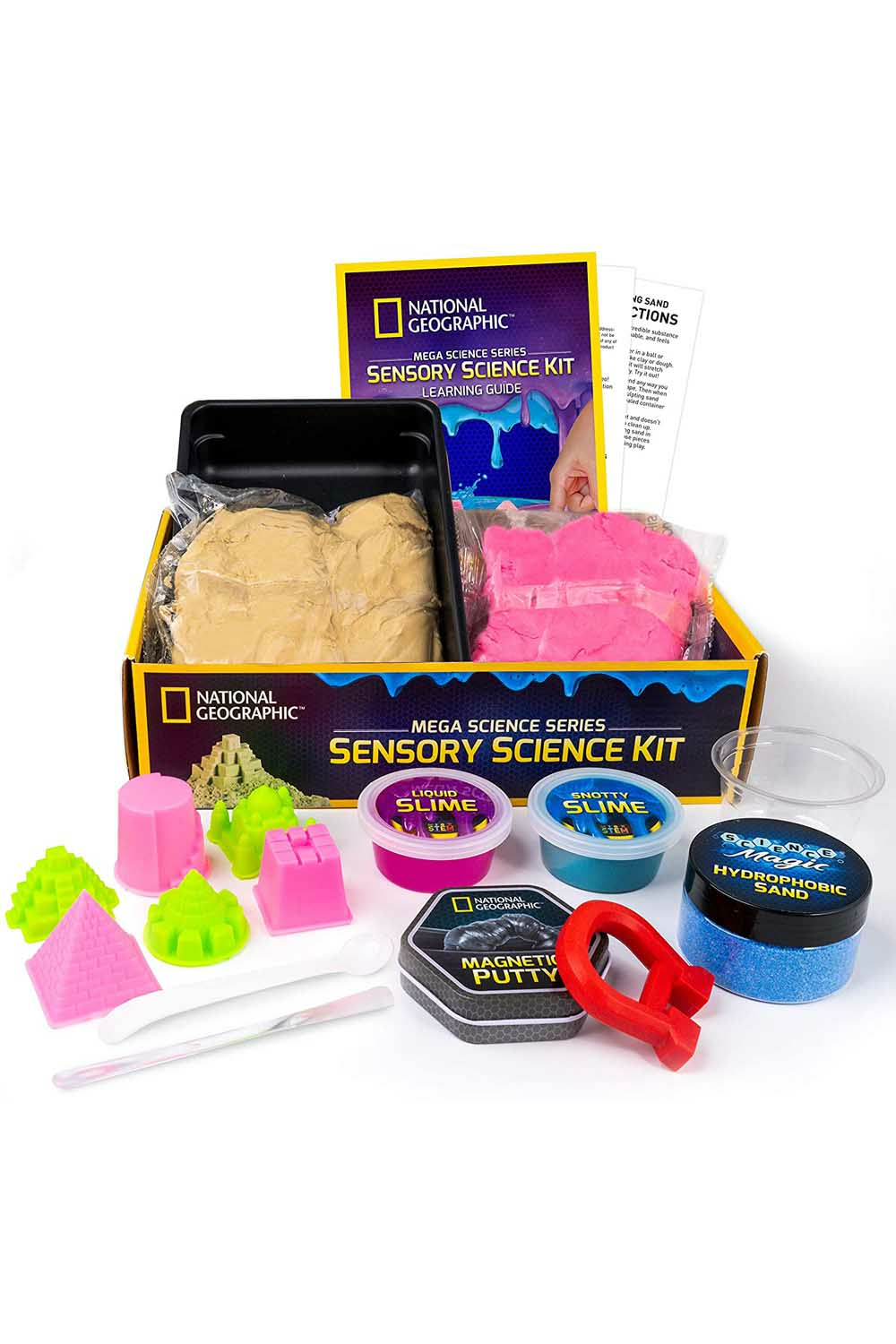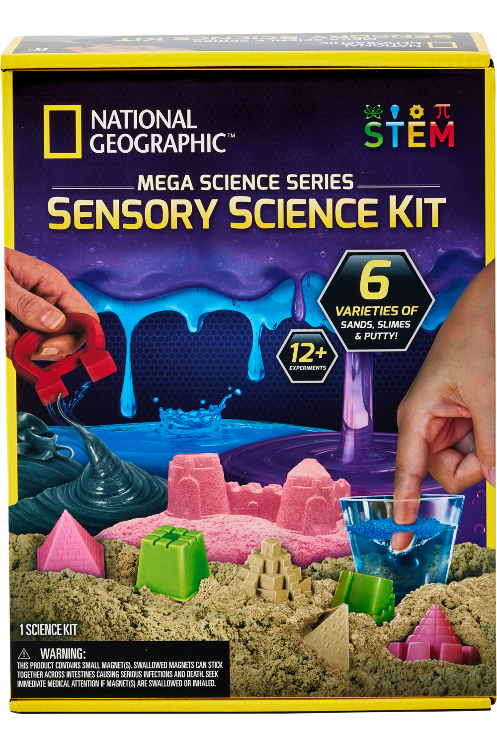 The National Geographic Mega Science Series Sensory Science Kit is a one-stop science pack with more than 12 awesome activities and 6 varieties of slime, putty, and play sand! The natural play sand comes with 6 sand moulds and a convenient play tray. It won't dry out, so there is endless amounts of time for imaginative play! Sculpting sand is unlike any sensory sand you've seen! It feels amazing, holds its shape, and is also soft and fluffy in your hands. Hydrophobic sand is an incredible sand to conduct experiments with, since it never gets wet! The snotty slime and liquid slime come pre-made, so are ready to play right out of the box. The textural differences between the two are astounding! The easy-to-follow instructions also include a number of slime recipes you can make at home with common household items. Magnetic putty comes in the kit as well, along with a horseshoe magnet that makes the putty move on its own! This kit is great for families that like to play together, and the detailed learning guide provides plenty of science so is also perfect as part of home school curriculum.