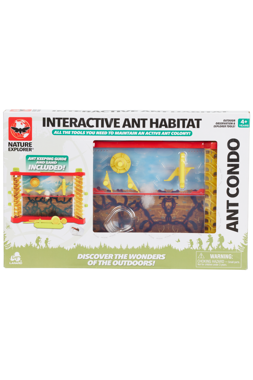 Discover the wonders of the outdoors and observe the amazing actions of ants with the Nature Explorer Interactive Ant Habitat! Containing everything you need to house and maintain a small colony of ants, interact with your ants by feeding and providing them water to maintain your active colony and be excited as they dig, move, and build their environment! Please note this kit does not come with ants.