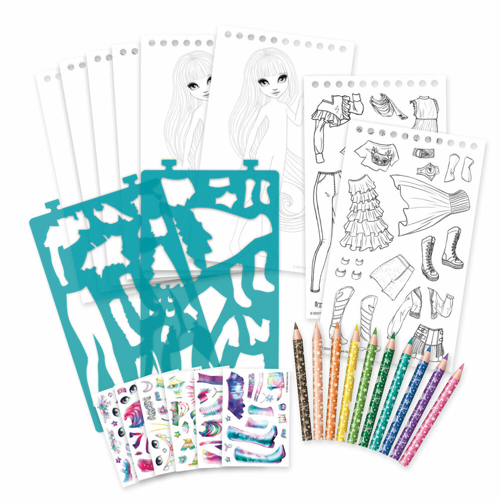 - Contents: 20 sketch pages, 28 stencils, 100 stickers, 10 colouring pencils, Colour instructions