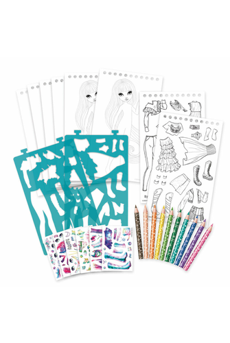 Inspiration can come at any time! This practical designer set will allow you to develop your fashion sense anywhere you go. Magnetic book closure, contains everything needed inside to sketch everywhere. Perfect format for travelling. Book includes 20 sketch pages, 2 stencil pages 6 mini sticker pages, 10 colouring pencils and colour instructions