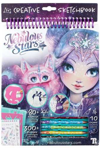 Create an awesome environment with this creative sketchbook based around the mystical star creature Nebulia. Nebulia lives in a cosmic clouds surrounded by the beauty of the stars. The Nebulous Stars universe offers children a unique environment that combines aesthetics, well-being, and positive values. Contents: 45 sketch pages, over 80 stencils and inspiration designs, 3 rub-on patterns, 2 colour sticker sheets, 2 colour-in sticker pages, 5 double ended colouring pencils, 8 drawing techniques, 3 different sections, colour theory, and instructions.