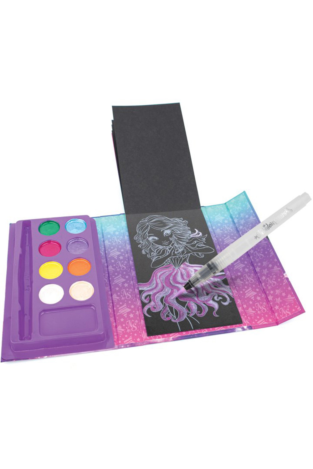 With this small creative book your budding artist can colour in the black pages with beautiful designs using the included watercolour brush and paints. This set includes a refillable watercolour brush and 8 stunning metallic paints!