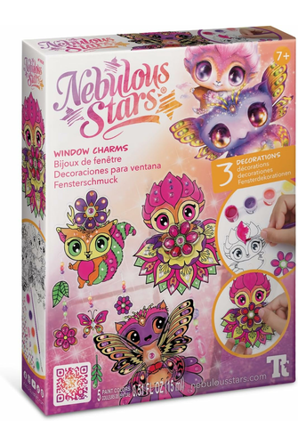 Design and paint three unique hanging charms using vibrant glass paints, rhinestones, and beads to add a creative touch to any window. Comes with 13 pre-cut pieces, 5 colours of glass paint, a paintbrush, assorted beads and cord, rhinestones, and 3 suction cups for easy hanging. This DIY craft kit allows kids to explore their artistic skills while designing colourful, eye-catching window decorations. Helps develop fine motor skills, patience, and attention to detail while providing an engaging hands-on activity for young creators.