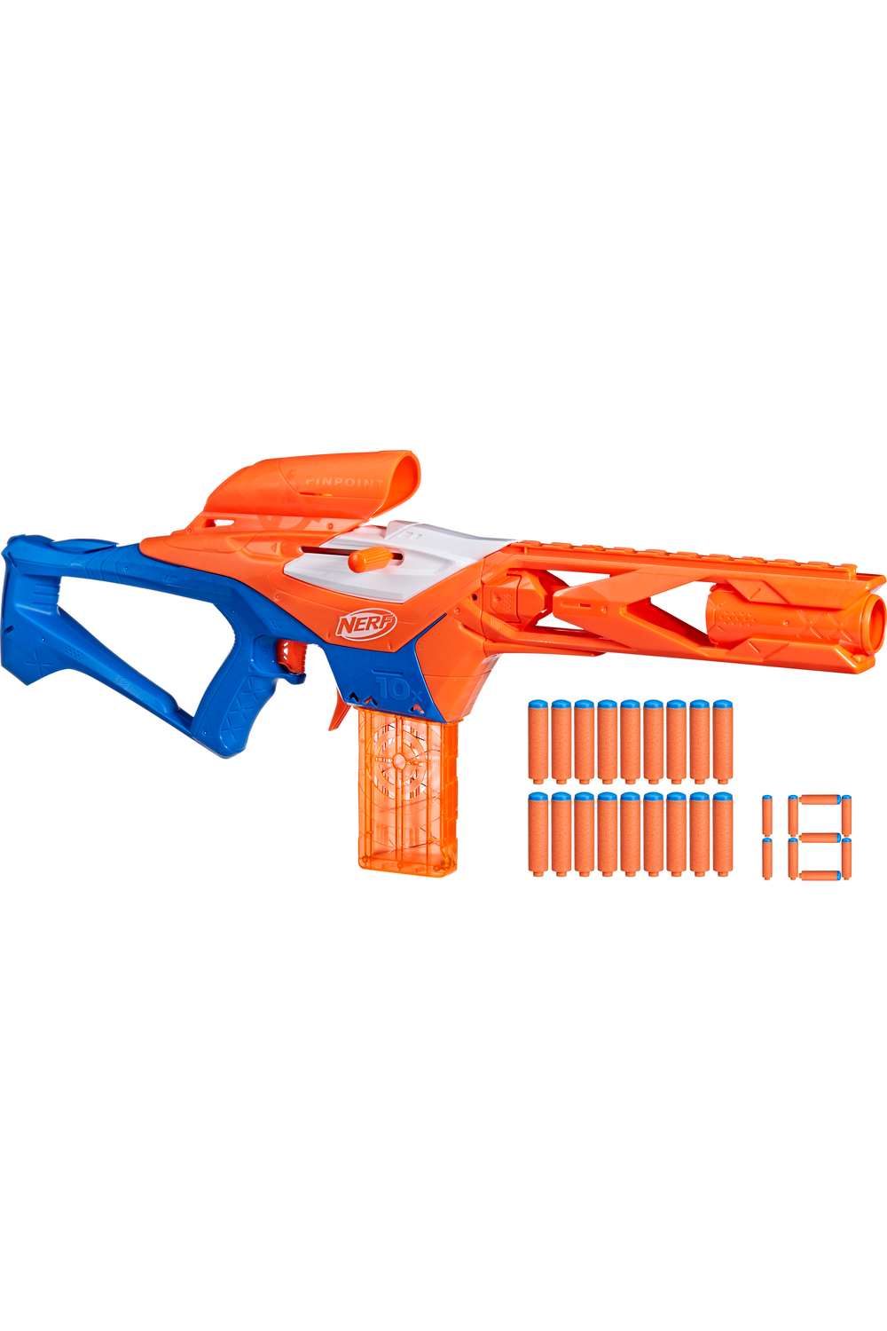 Only available in-store, not available online. The Nerf brand levels up your game with high-performance Nerf N Series dart blasters and Nerf N1 darts! You have the skills as a Nerf battler, now you have the blaster and darts to gain a superior edge in indoor and outdoor play. From the creators of the foam dart, the Nerf brand unleashes the next evolution in foam dart blasting with Nerf N Series N1 darts, delivering EXTREME ACCURACY, SPEED, and DISTANCE! The Nerf N Series Pinpoint dart blaster is built for accuracy with cool styling and features that give you a targeting advantage in Nerf backyard games. The bolt-action blaster has a 10-dart clip and includes 18 Nerf N1 foam darts, giving you enough darts to fully load the clip and additional darts for reloads. To play, load darts into the clip, load the clip into the blaster, move the priming bolt backward and forward, and pull the trigger to fire a dart. Nerf N Series blasters are compatible only with Nerf N1 darts. Eyewear recommended (not included).