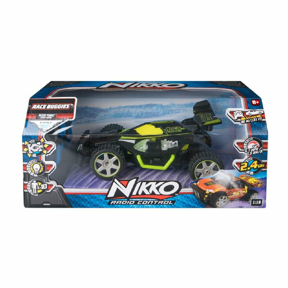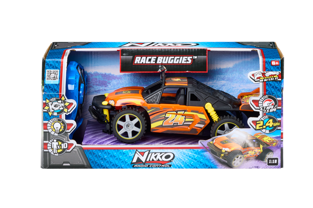 Designed with full-function, multi-directional control and blazing speed, this high-performance buggy is made for speed runs, stunts, and night-time fun. Equipped with 2.4GHz transmission technology, you'll enjoy smooth, interference-free driving. And when the sun goes down, built-in trail lights keep the action going with style and visibility. With top speeds reaching 4.7 mph (7.5 km/h) and a durable, tested design, the Hyper Blaze is built to perform on and off the beaten path. Backed by Nikko's legacy of innovation and quality, it's a name you can trust for epic fun that lasts.