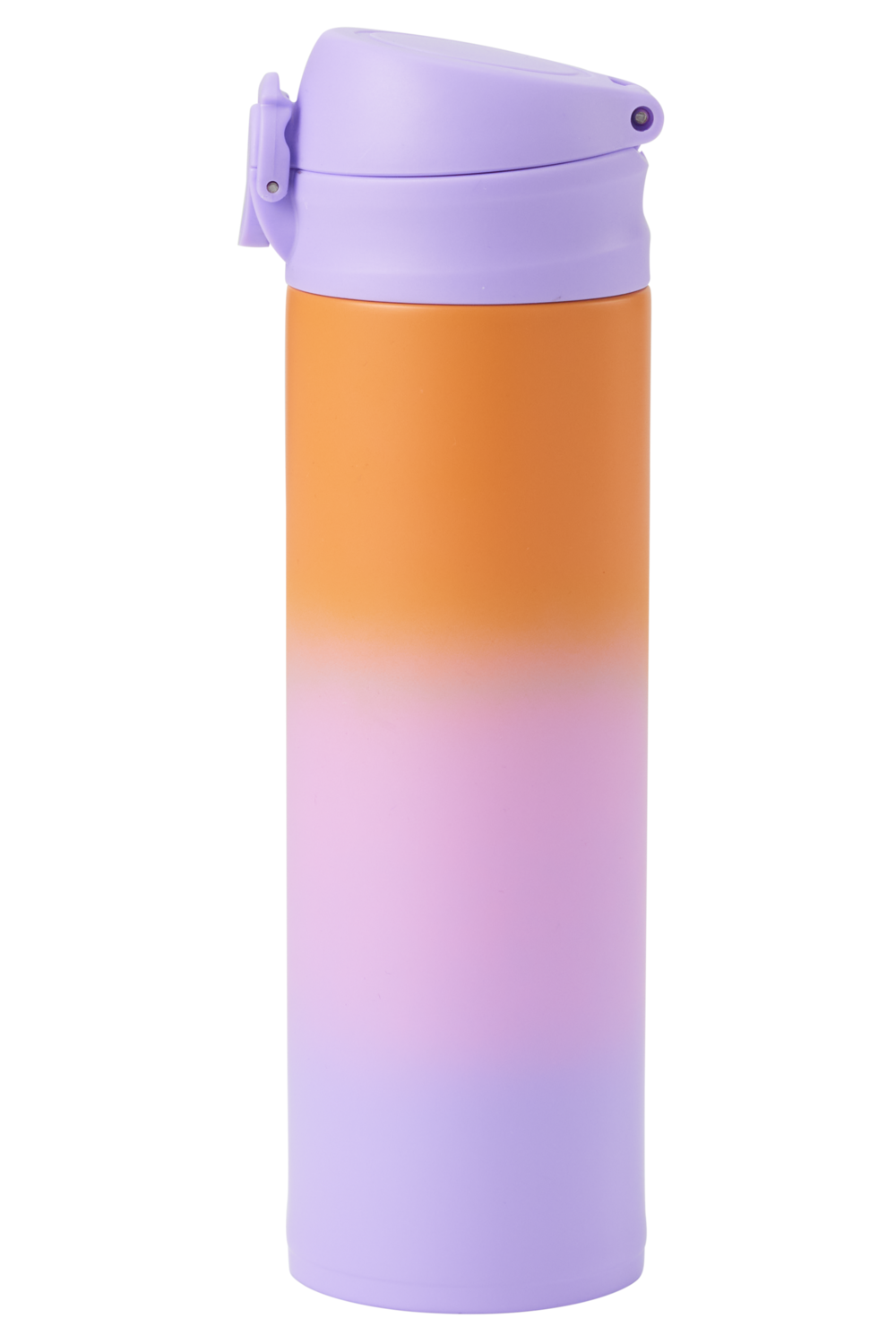 Stay hydrated gorgeous 400ml metal drink bottle from the Noted Aura range. Featuring a beautiful orange-to-purple ombre and a button operated flip-top lid with a clasp to keep the lid secure, this bottle keeps your drink hot or cold for hours.
