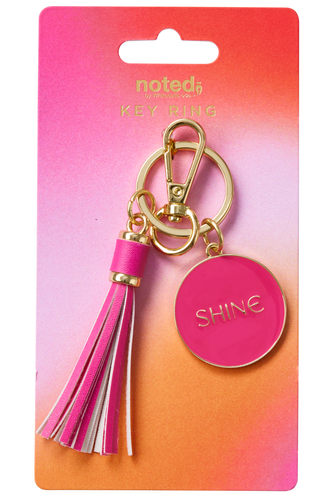 Add a little bit of flair to your pencil cases, bags or keys with this elegant keyring from the Noted Aura range. Featuring a pink tassel and a charm with the word "Shine" in gold on a pink background.