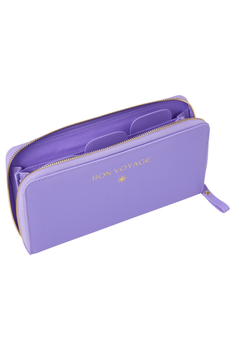 Travel the world in style while keeping all your travel documents safe and together with this stylish purple travel wallet from the Noted Aura range. The zip wallet features the words "bon voyage" stamped in gold foil on the cover, 4 internal compartments with dividers for easy storage, plus a internal zipped compartment, and a pen holder. Perfect for holding plane tickets, passports, accommodation information and more.