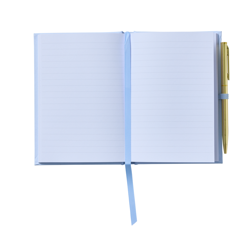 Write down all your important notes and thoughts with this A6 notebook from the Noted Belle range featuring a gorgeous floral wreath design with gold foil accents on a light blue hardcover. This notebook features white lined pages, a ribbon marker, a twist-mechanism pen with black ink, and is perfect for when you're at home, the office, or on the go.