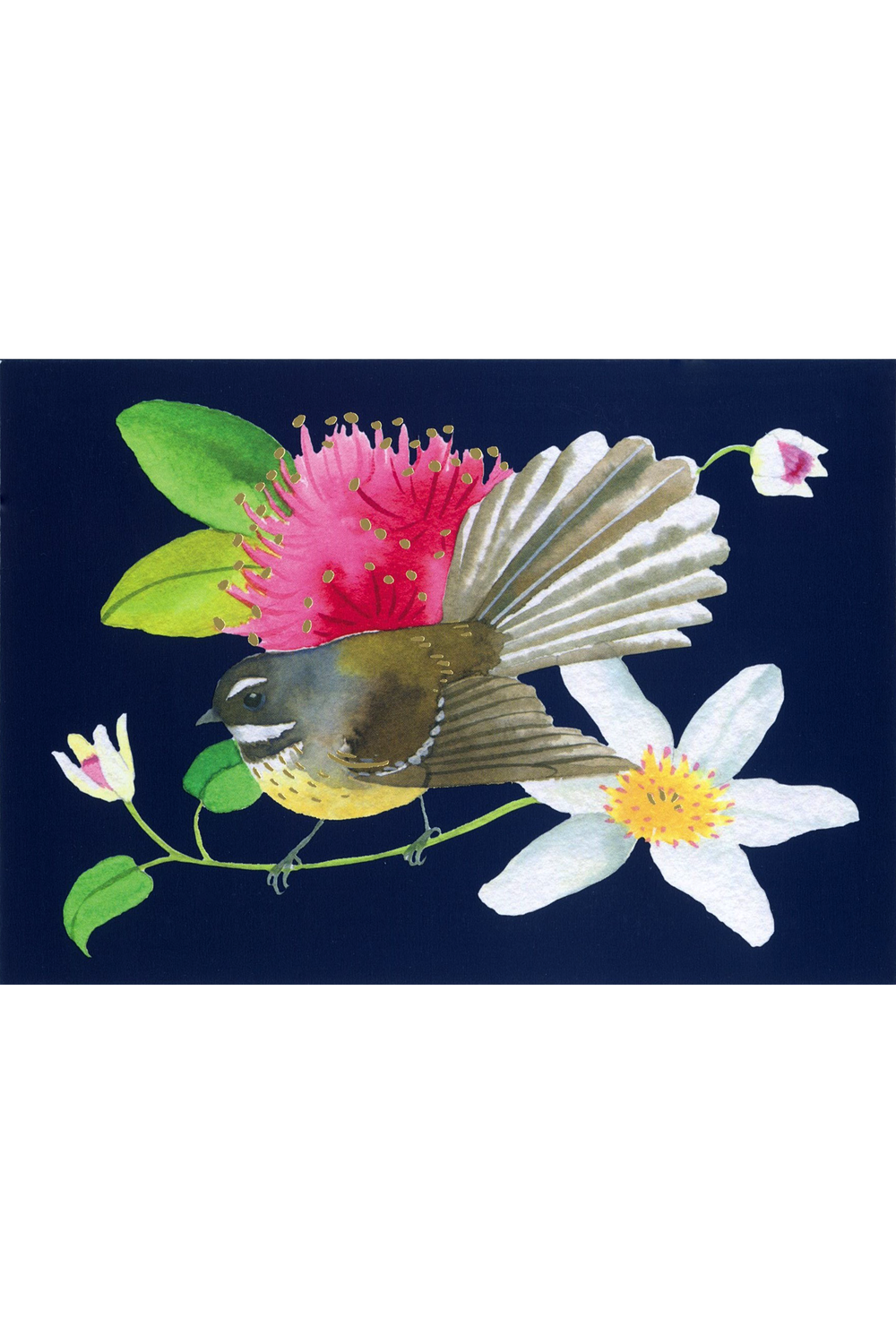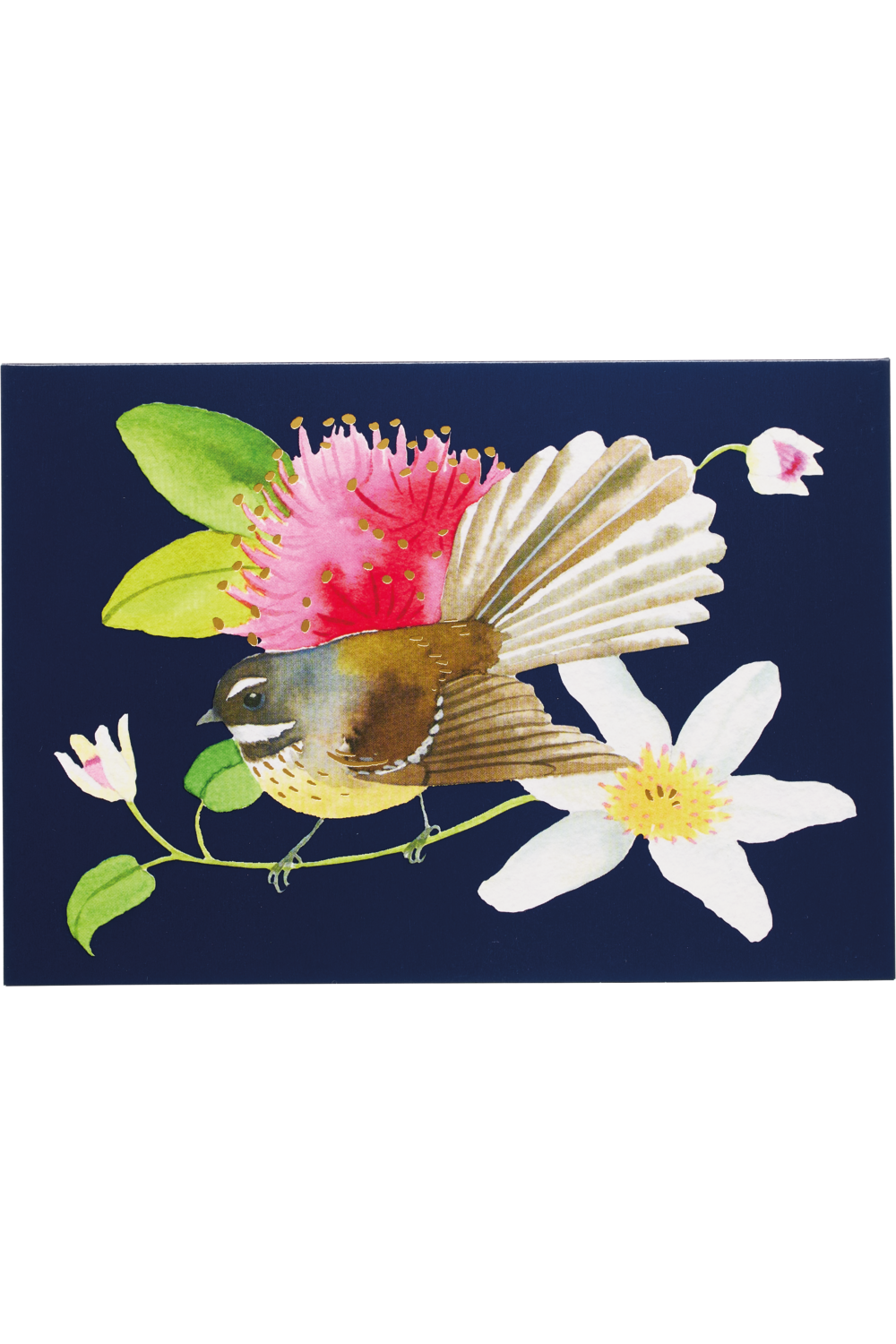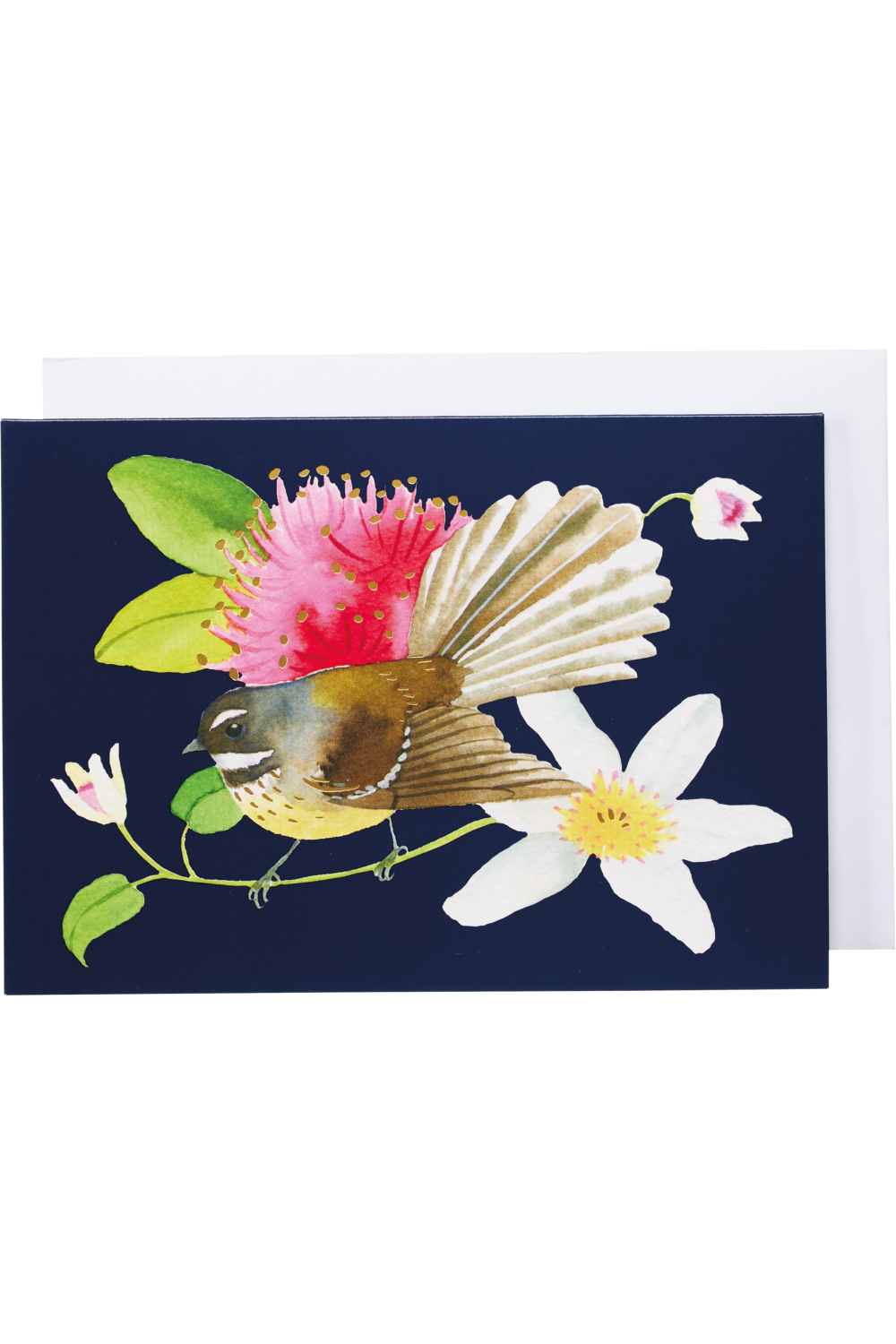 A beautifully designed Noted notecard featuring a stunning watercolour fantail and flower design with gold foil accents on a midnight blue card. Card is left blank inside for you to add your own special message and comes with a white envelope.