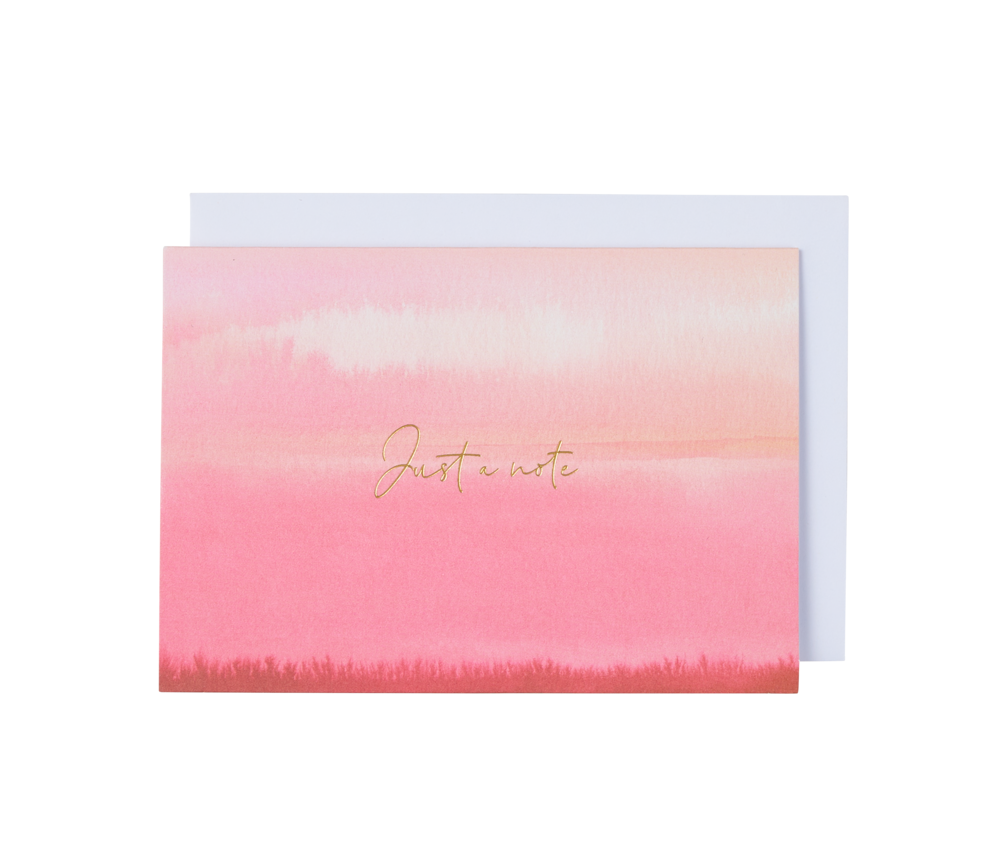 A pack of 8 beautifully designed Noted notecards featuring a beautiful pink watercolour card with the words 'Just a note' in a beautiful gold foil script. Card is left blank inside for you to add your own special message and comes with a white envelope.