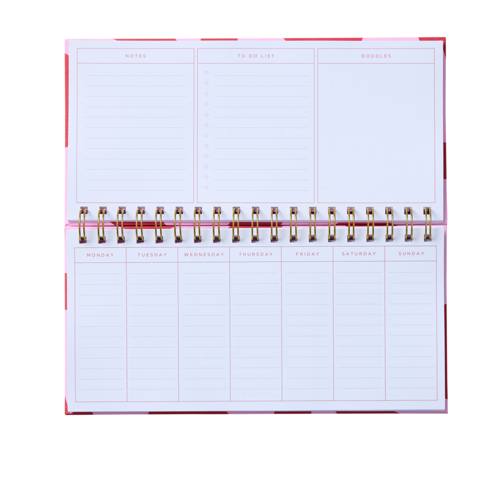 Keep your week organised and at a glance with this wiro-bound weekly planner from the Noted Brights range featuring a red swirl design on a pink hardcover. This undated planner features a week-to-view format with sections for notes, to-do lists, and doodles.