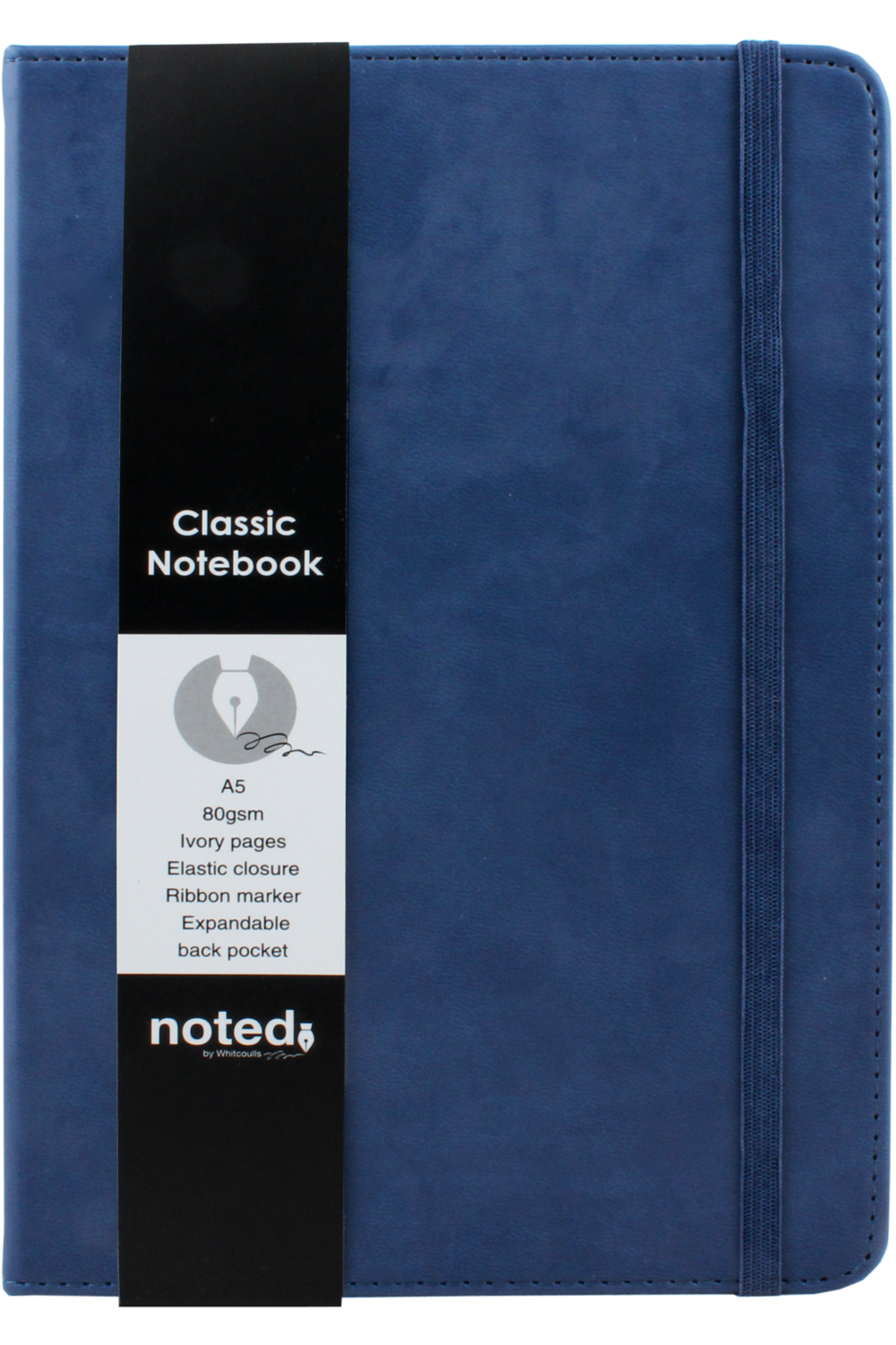 Noted Classic notebooks combine great value with traditional styling. The Noted Classic A5 notebook has a soft and durable leather like cover and lined ivory pages, and features an elastic closure and an expandable back inside pocket. Perfect for everyday use.