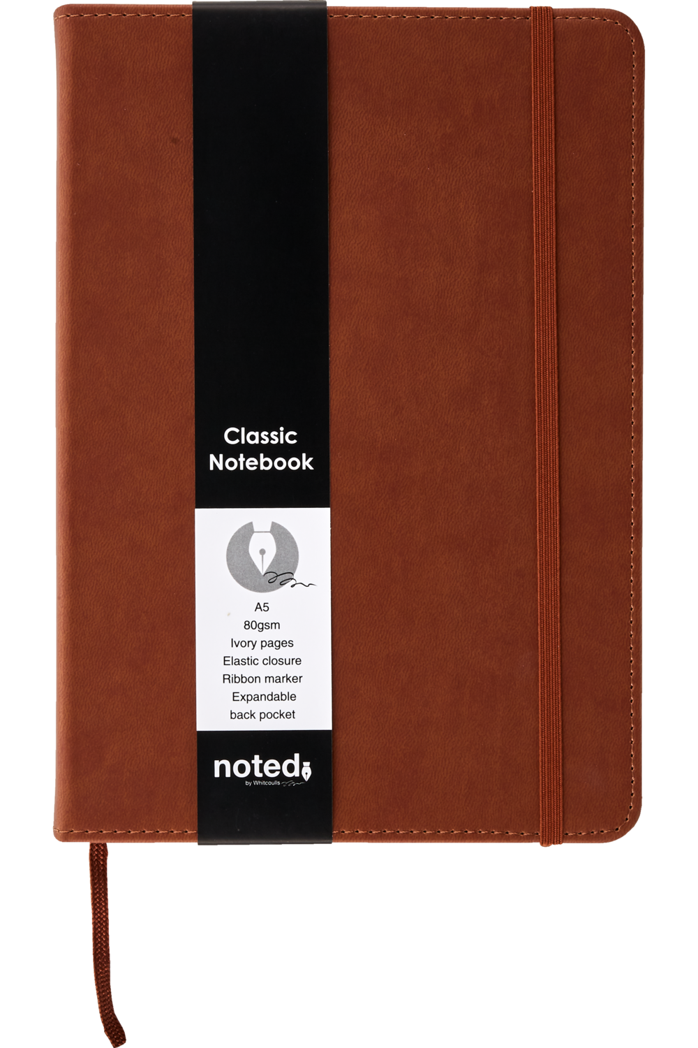 Noted Classic notebooks combine great value with traditional styling. The Noted Classic A5 Notebook has a soft and durable leather like cover in dark tan and lined ivory pages.