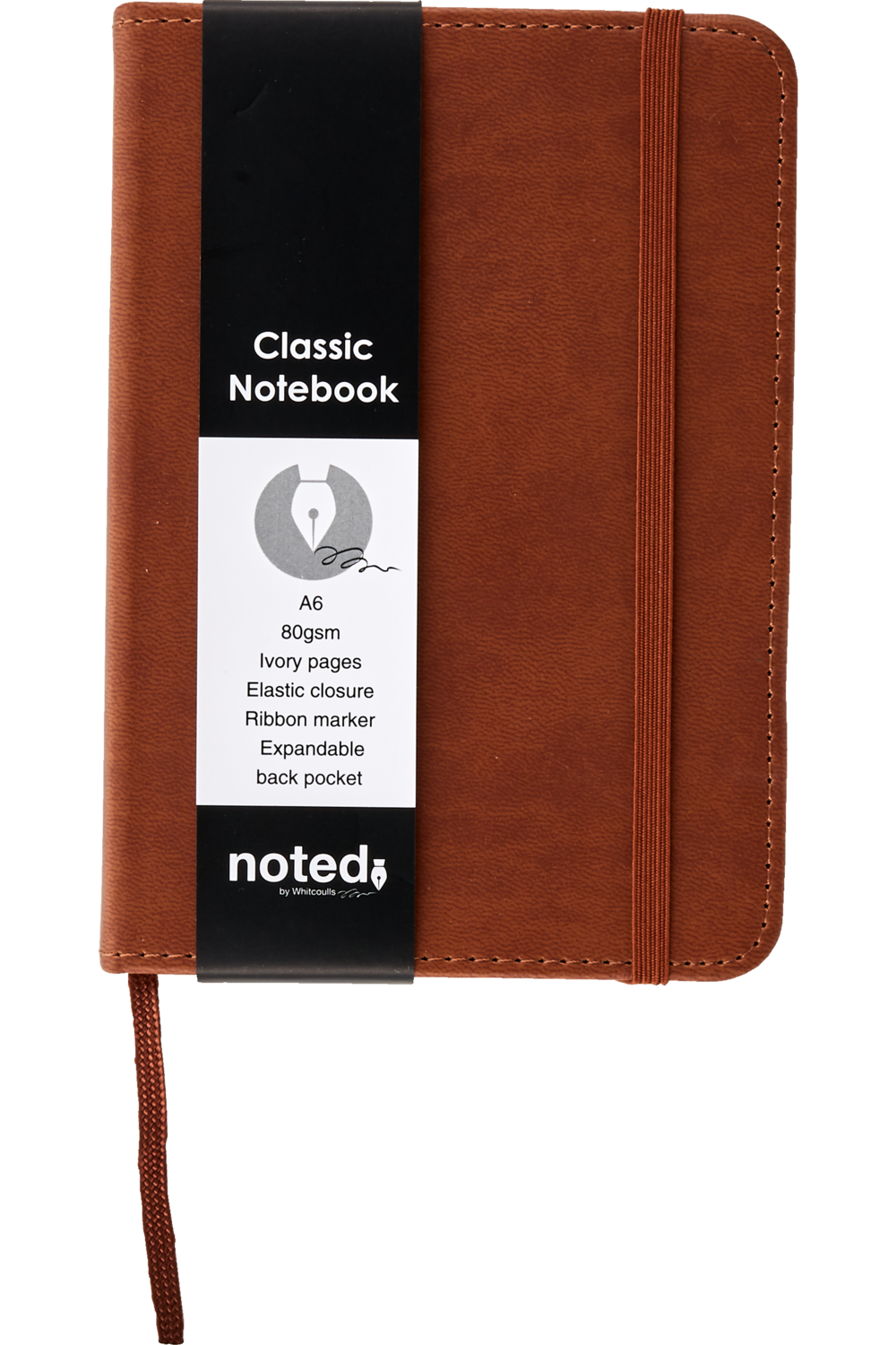 Noted Classic notebooks combine great value with traditional styling. The Noted Classic A6 Journal has a soft and durable leather like cover and lined ivory pages, and features an elastic closure and an expandable back inside pocket. Perfect for everyday use.