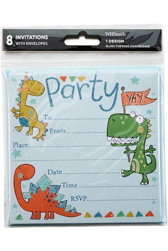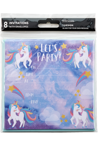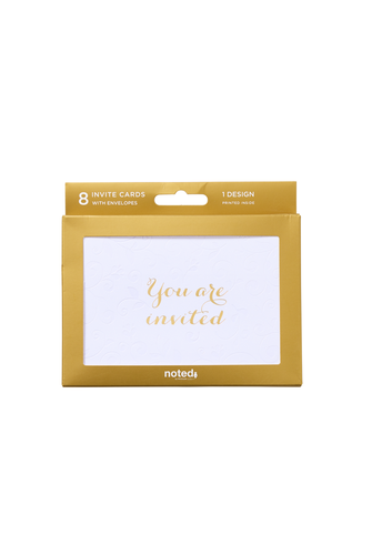 A pack of eight beautifully designed invitation cards featuring a grey coloured background with stars and the words 'You are invited' in stamped in gold foil. The inside of the card contains space for a name, event, date, time, place, RSVP and sender. Includes white envelopes. Eight cards of a single design.
