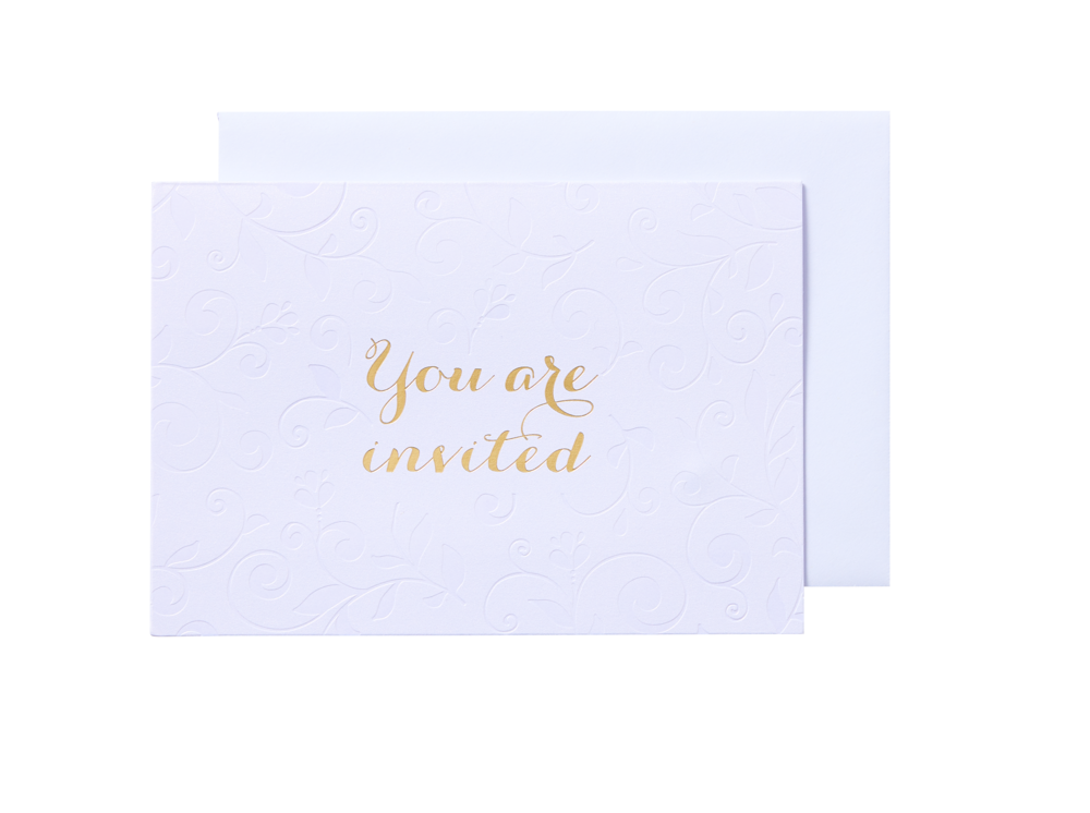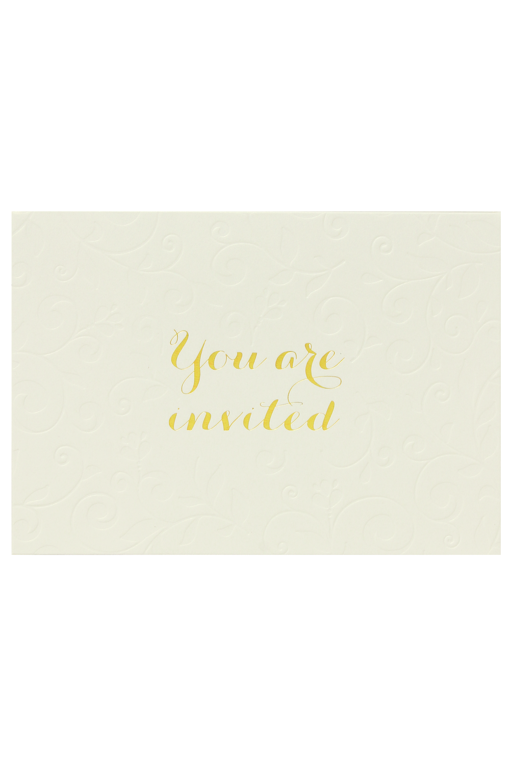 A pack of eight beautifully designed invitation cards featuring a pearl coloured background with a debossed floral pattern and the words 'You are invited' in gold foil lettering. The inside of the card contains space for a name, event, date, time, place, RSVP and sender. Includes white envelopes. Eight cards of a single design.