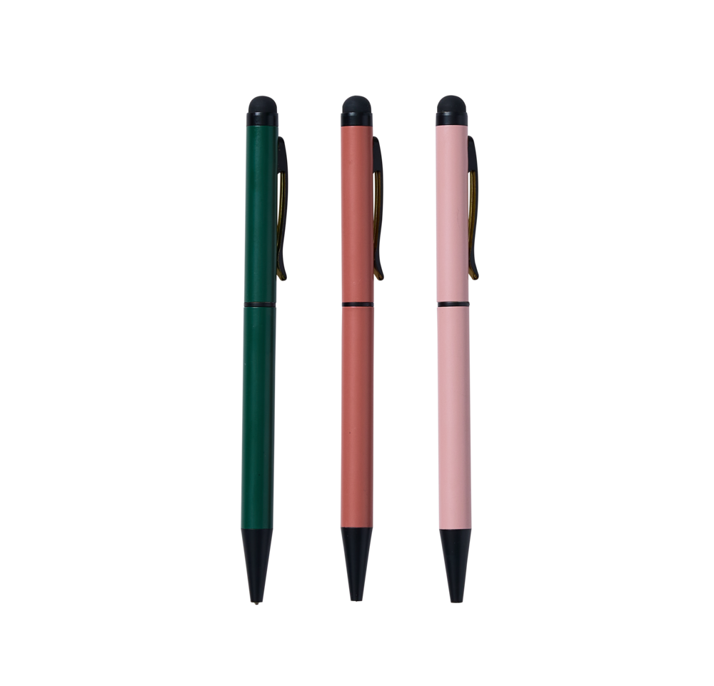 Fashionable and functional, this pack of 3 stylus pens from the Noted Rosa range is a perfect addition to your stationery set. These beautiful pens come with black ink, an array of green, brown, and pink barrels, a twist mechanism, and a touch screen stylus end.