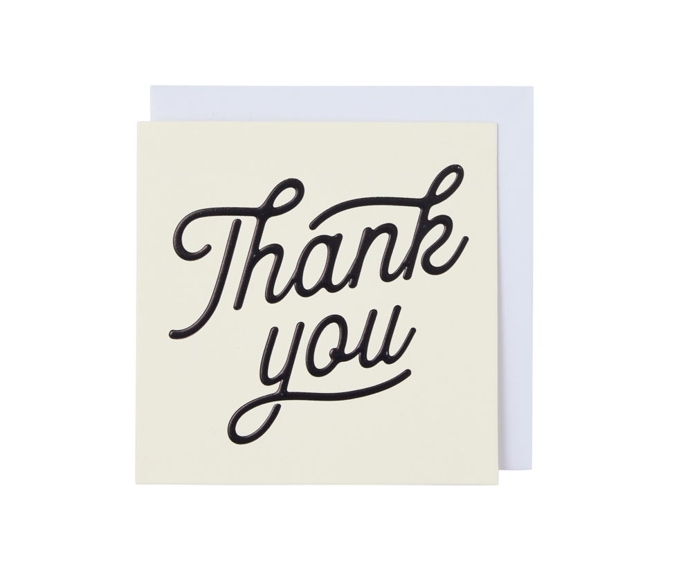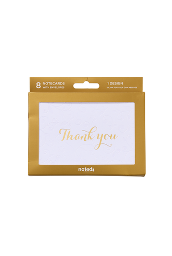 A pack of eight beautifully designed thank you cards featuring the words 'Thank You' in a beautiful script. The inside of the card is left blank for your own personal message. Includes white envelopes. Eight cards of a single design.