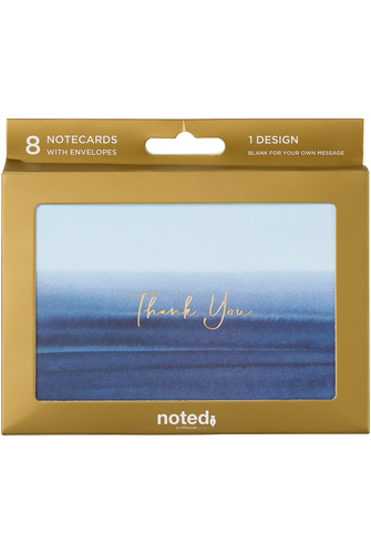 A pack of eight beautifully designed thank you cards featuring a beautiful blue watercolour card with the words 'Thank You' in a beautiful gold foil script. The inside of the card is left blank for your own personal message. Includes white envelopes. Eight cards of a single design.