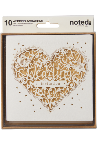 Make your wedding invitations stand out with a pack of 10 elegant laser cut-out note cards from Noted. The perfect elegant touch to a gold and cream theme. Matching Kraft envelopes included for easy postage. Exclusive to Whitcoulls.- Card Dimensions: 12cm x 12cm