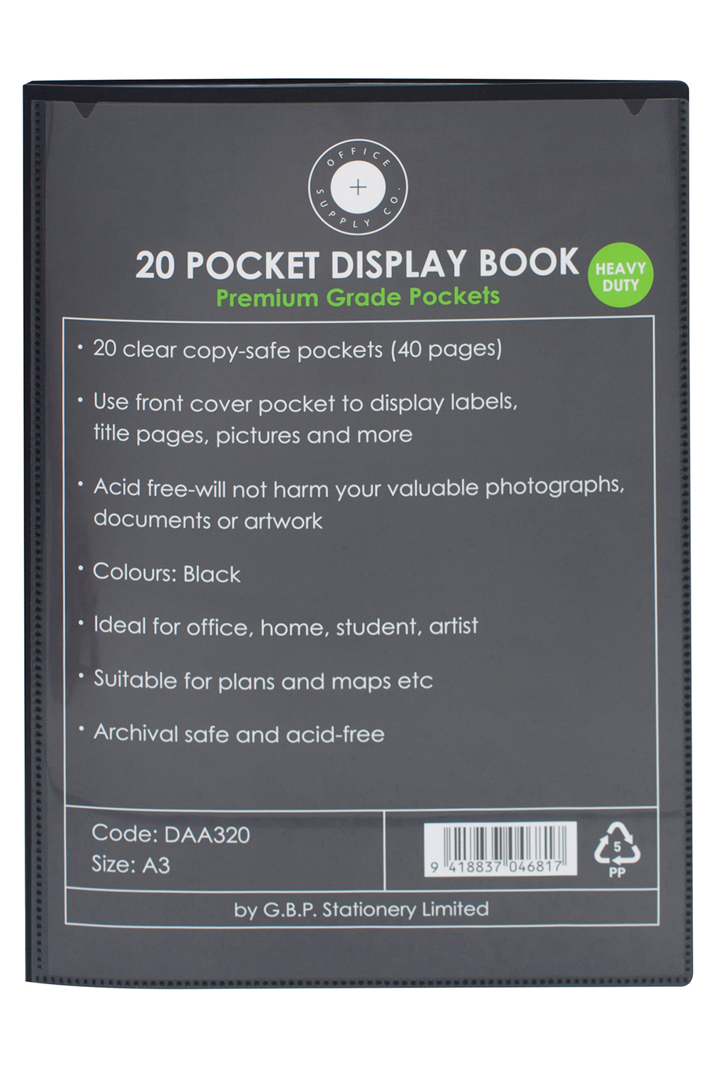 The Okin A3 display book is ideal for the office, home as well as students and artists. This book was made acid-free so you can carefully store, protect and present your valuable documents, photos, plans, maps, art and more. The clear pages are securely bound into the spine of the durable polypropylene cover. Display book comes in a black colour and A3 size with a 20 pocket, 40 page capacity. Packaging may vary. Only available in store, not available online.