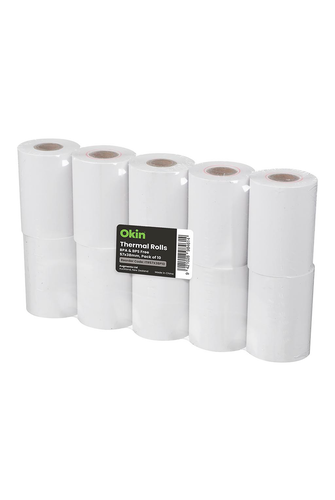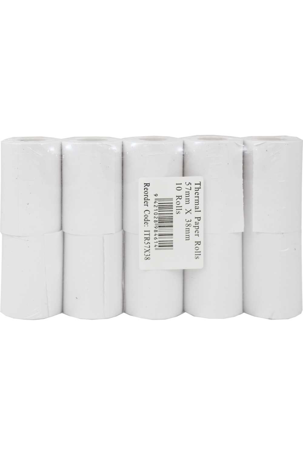 A pack of 10 thermal paper rolls measuring 57mm wide. Please note, packaging may vary.