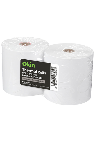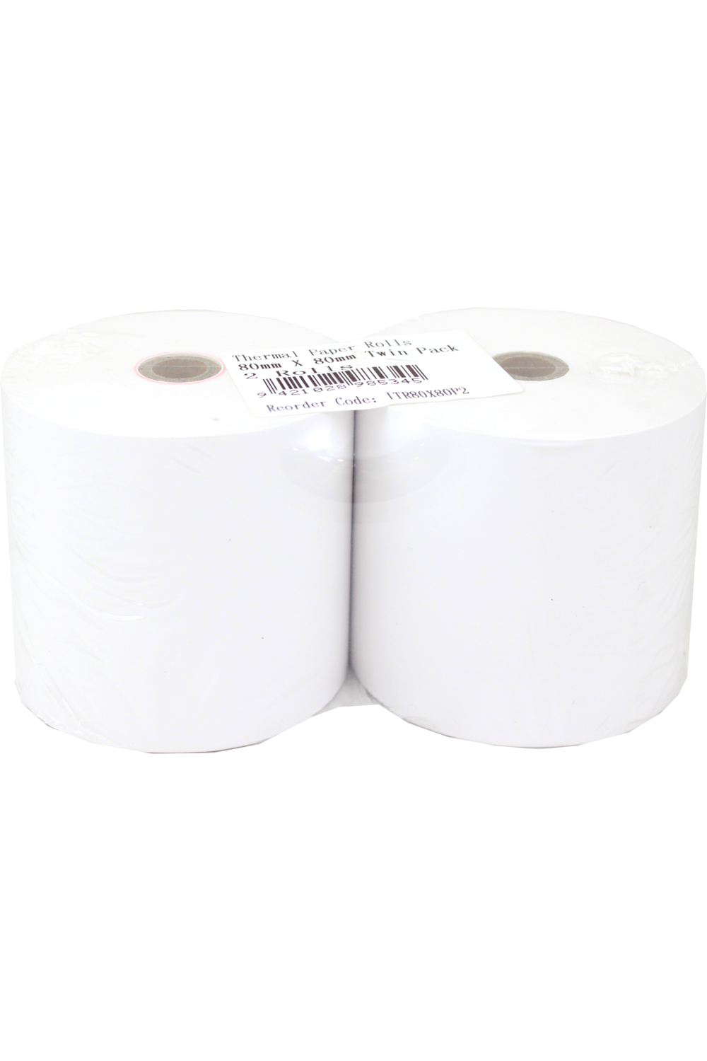 A pack of 2 thermal paper rolls measuring 80mm wide. Packaging may vary.