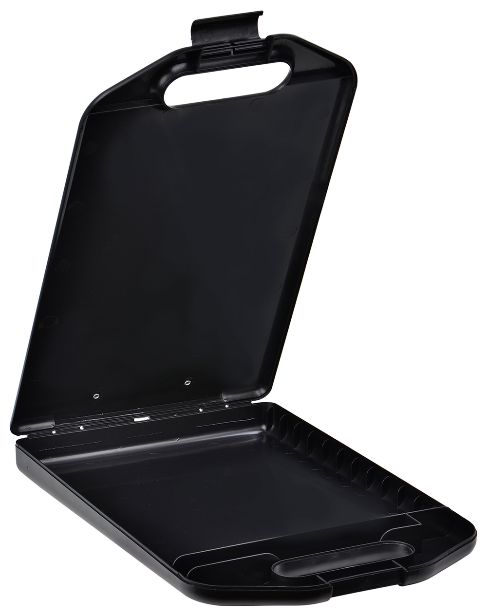 Office Supply Co storage clipboard has a weatherproof design with a heavy duty clip and handle. Ideal for keeping paperwork safe and secure. Also features a compartment for pens. Storage depth of 27.5mm. Black colour. A4 size.