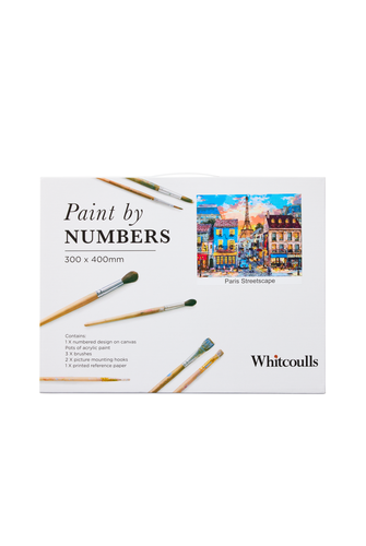 Perfect for budding artists perfecting their craft, this paint by numbers set allows you to paint a beautiful scene of a Paris streetscape, just like the professionals! This set includes everything you need: a numbered design on a canvas, pots of acrylic paint, 3 brushes, 2 picture mounting hooks, and a printed reference paper.