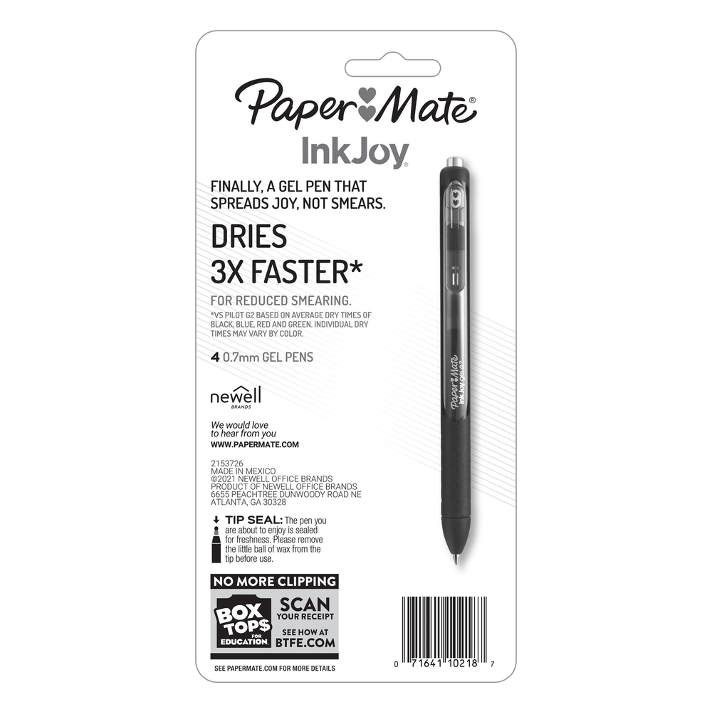 Spread joy (not smears) with quick-drying Paper Mate InkJoy Gel Pens. Quick-drying ink dries fast for reduced smearing. Retractable design is ready to write with just a click and the ergonomic comfort grip ensures a breezy writing experience.