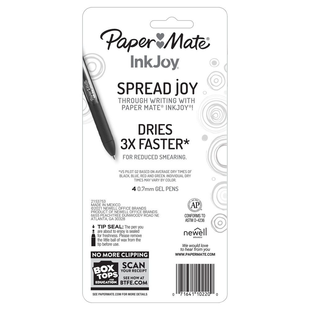 Spread joy (not smears) with quick-drying Paper Mate InkJoy Gel Pens. Quick-drying ink dries fast for reduced smearing. Retractable design is ready to write with just a click and the ergonomic comfort grip ensures a breezy writing experience.