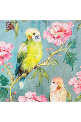 A pack of 20 3-ply lunch napkins featuring an stunning design of vibrant painted parakeets sitting amongst flowers on a teal background from Paperproducts Design. Paperproducts Design napkins are printed on oxygen bleached tissue with water based colours.