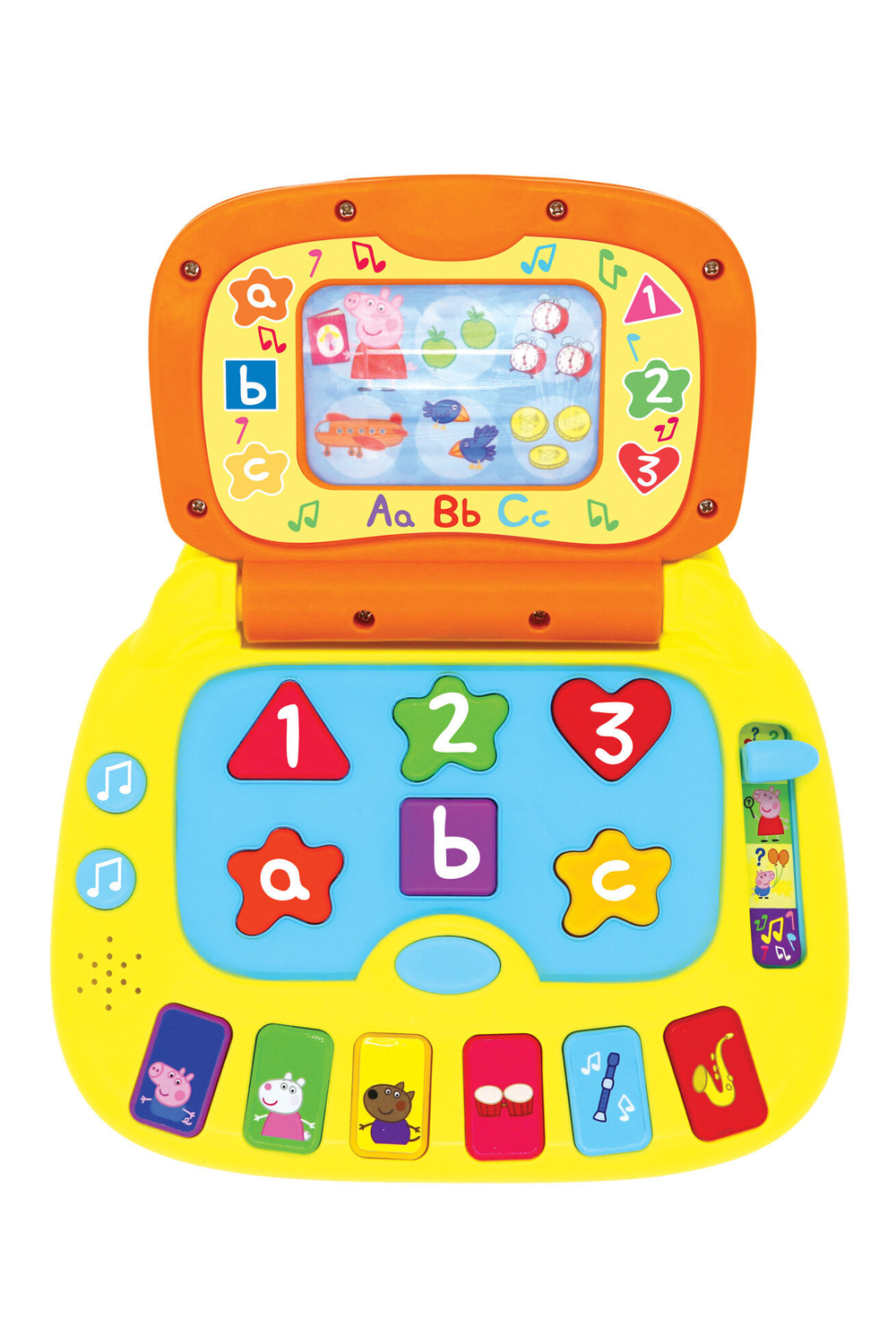 Learn, shapes, numbers, letters and colours on the go with Peppa! The Laugh & Learn Laptop is great for learning on the go. With a portable carry handle and lift-up screen, it features 4 fantastic games to help little ones learn colours, numbers and letters. Featuring familiar characters from the hit show, the chunky screen and buttons are easy to use for little hands, and kids minds will be stimulated by the bold shapes and bright pictures on display.
