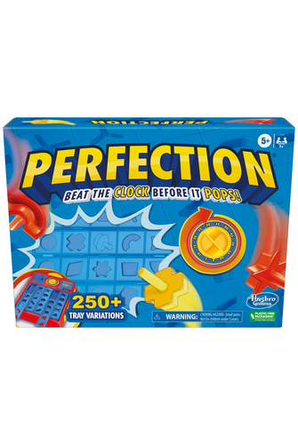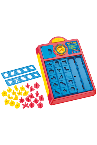 The Perfection preschool and kids' pop up game has players on the edge of their seats as they try to beat the clock before the pieces pop! Be the quickest to fit the shapes into their matching holes in the tray. But watch the timer! If it runs out... pop goes the Perfection game! This edition of this fun kids' memory game lets players customize the trays: rotate them, flip 'em over, and swap them around... there are over 250 different combinations! Race against the clock before the pieces pop in Single-Player Mode, or players can race against friends in Multi-Player Mode and be the first to finish and press the pop button themselves. Play without the timer so that it's easier for younger players. And, when they're all done playing, easily store the pieces inside the game unit.