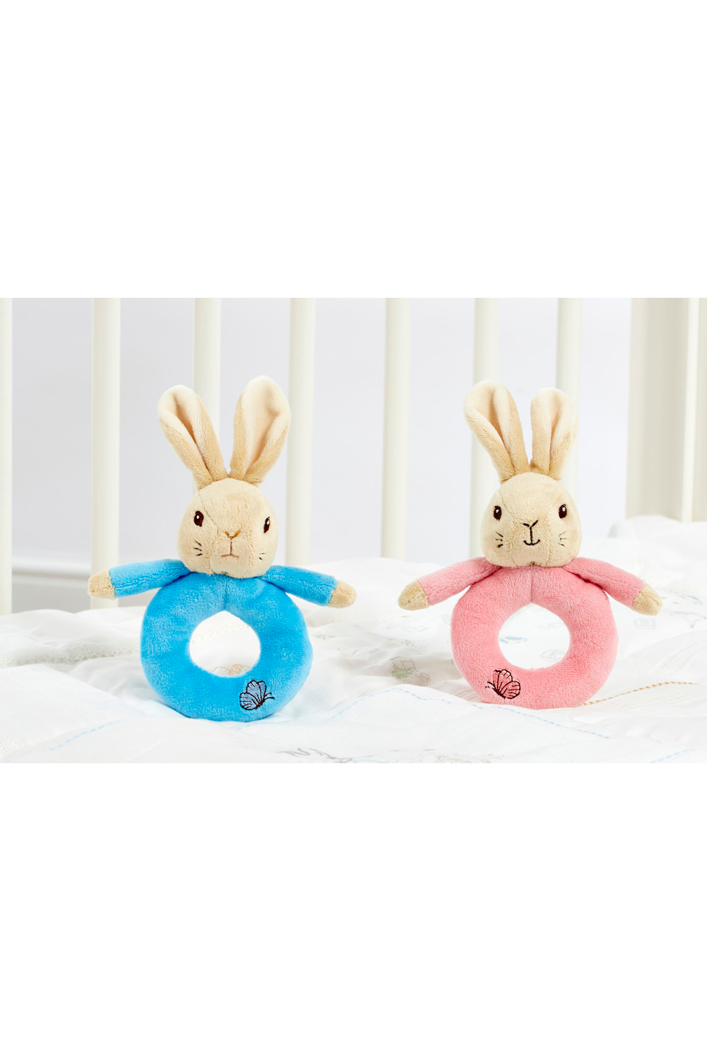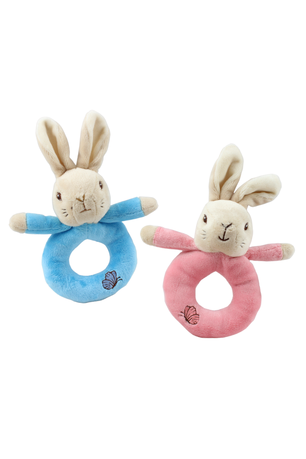 Introduce your little one to the classic tales of Peter Rabbit with these adorable rattle rings featuring one of two characters and a soft plush material. Suitable for all ages, these rattle rings are sure to delight even the youngest fans. Available in 2 designs: Peter Rabbit, or Flopsy Bunny.