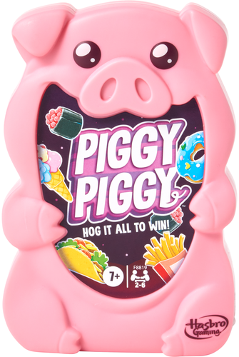 Hog it all to win! The Piggy Piggy game is a fast-paced family card game that's as easy as it is fun! Players take turns playing food cards from their hand to try to steal pigs and score the most points. Each player starts with 5 cards, including coloured food cards, such as tacos (yellow) and ice cream (pink). On their turn, a player plays all the cards they have from one type of food by placing it in a stack. If their stack has the most food, then they earn the same-coloured pig figure - or can steal it from another player! Have a goat card? Use it to sabotage an opponent by discarding a food card from their stack and maybe forcing them to give up their pig! When a player redraws cards at the end of their turn, if they have any pigs, they'll score a point for each drawn card that matches their pig's colour. Score 8 points first to win!
