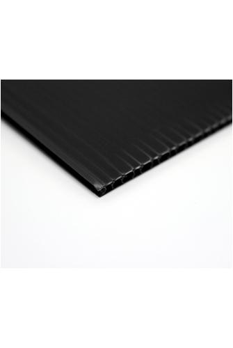 A sturdy 450 x 600mm piece of plasti-flute in black, suitable for arts and crafts, signage, school art projects, displaying artwork, and other creative projects.