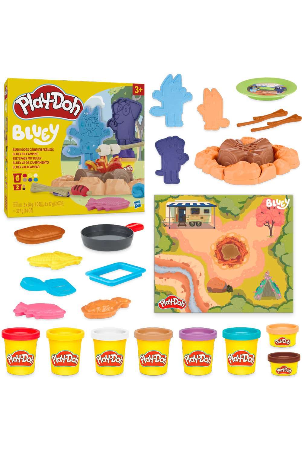 Create imaginative camping adventures with the Play-Doh Bluey Goes Camping Playset! This Bluey set comes with everything kids need to play out camping stories with their favourite Heelers and friends! Stamp out Bluey, Bingo, and Jean-Luc with the stampers, then use the Play-Doh tools and accessories to make a pretend meal with silly sausages, pretend peas, crazy carrots, imaginary eggs, and more. For dessert, why not try making pretend s'mores? The campsite playmat sets the scene and makes cleaning up easy when Play-Doh playtime is over. This Play-Doh kit comes with 14 ounces (397g) of modeling compound in 8 different colours.