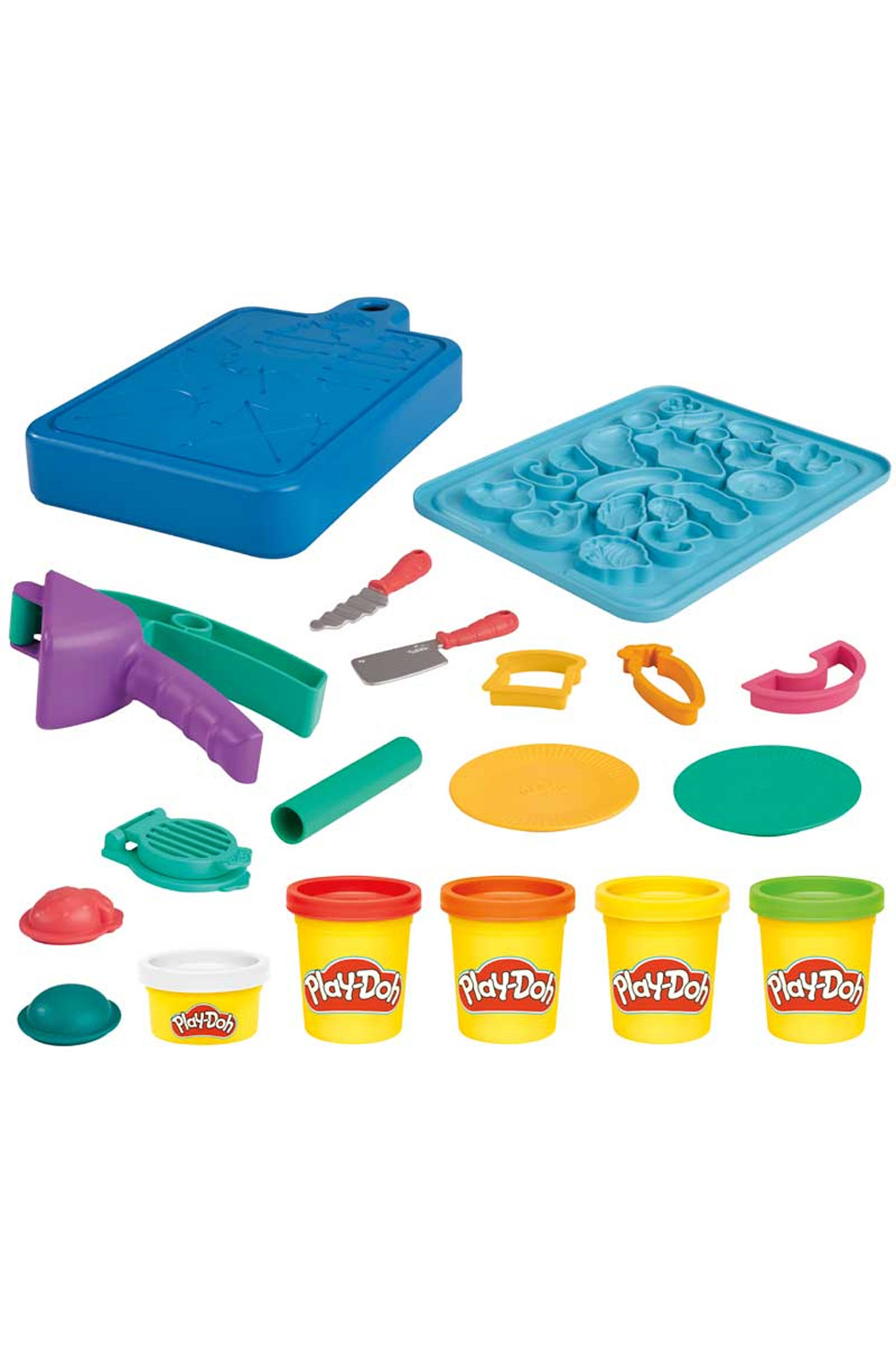 Let's get prepping! The Play-Doh Kitchen Creations Little Chef Starter Set is made for aspiring cooks, with 14 play kitchen accessories and 5 Play-Doh colours. Kids can cut out play food shapes using the molds and cutters, then follow the guidelines on the toy cutting board to slice and chop with the toy knives! They'll love to use the arts and crafts tools like the garlic press, egg slicer, and half-molds on the underside of the cutting board lid to make silly Play-Doh foods. This kitchen playset even comes with play dishes so kids can proudly present their creations.
